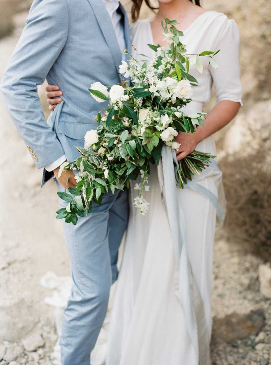 - Девушка – в простом платье, прическа – обычный пучок, скромный, слегка растрепанный букет из белых цветов;