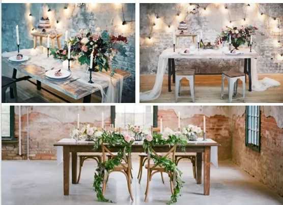 Похож на урбан-шик, но более брутальный. Предусматривает мероприятие в производственном помещении, складе или зале с большим количеством заводских или фабричных аксессуаров.