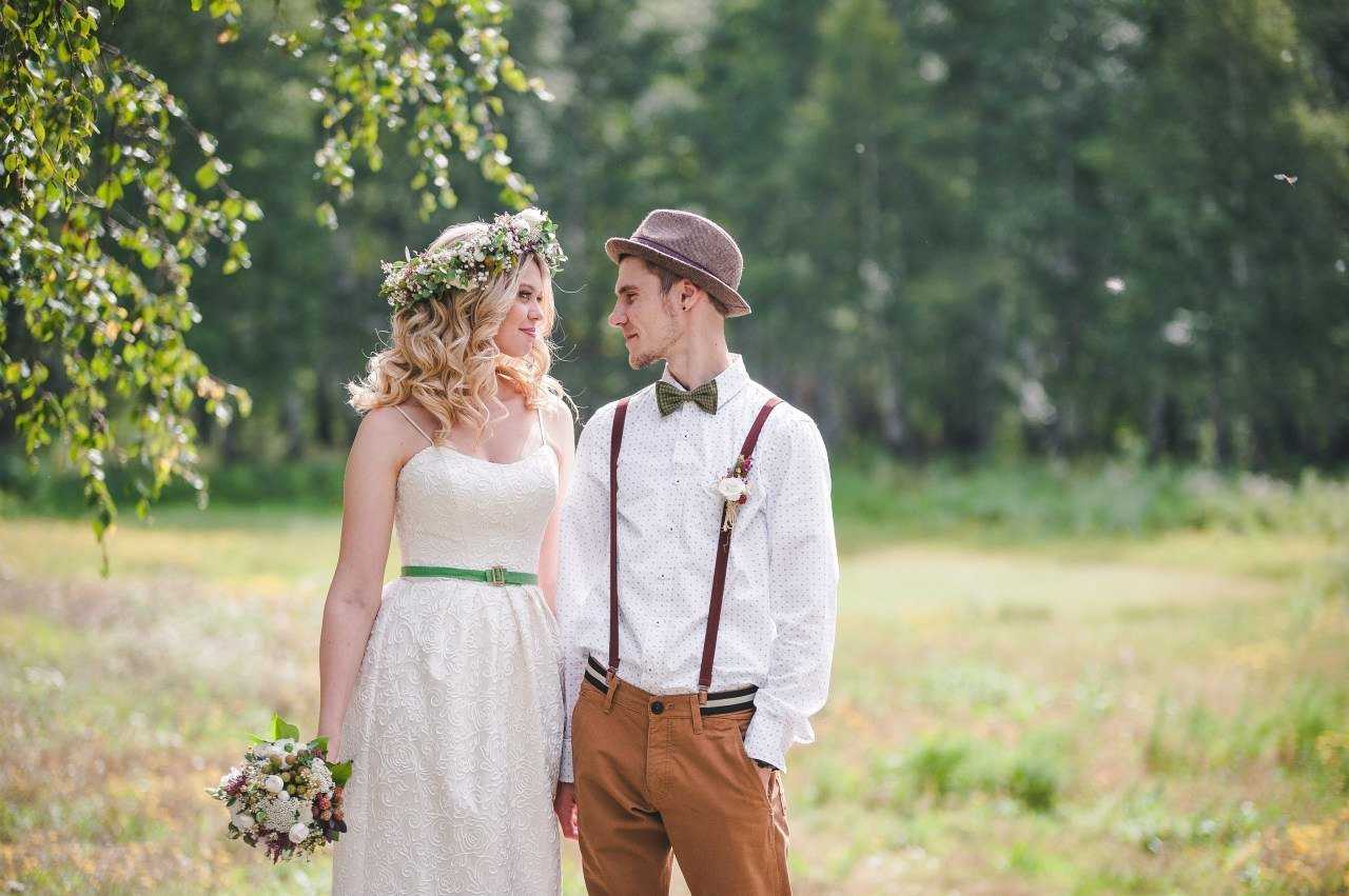 Молодожены должны быть в одеждах из натуральных тканей летящего силуэта. Украшения – из дерева. Макияж невесты – максимально незаметный, прическа – несложная.