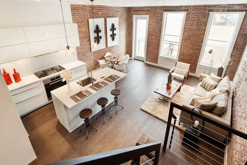 В целом лофт, больше похож на цеховое помещение. Здесь красиво впишутся как белые кирпичи, так и немного ржавые конструкции. При наличии бурной фантазии можно добавить в интерьер даже граффити!