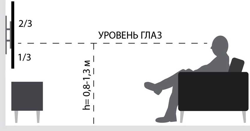 Чтобы определить, на какой высоте от пола вешать телевизор в зале, следует удобно сесть и посмотреть прямо на стену. Голова не должна запрокидываться, чтобы не создавать нагрузку на шейный отдел позвоночника. Направление глаз укажет на точку, которая должна стать серединой экрана.