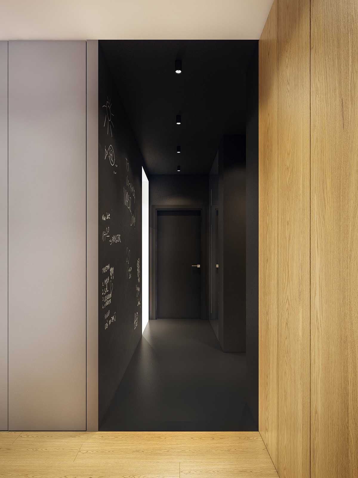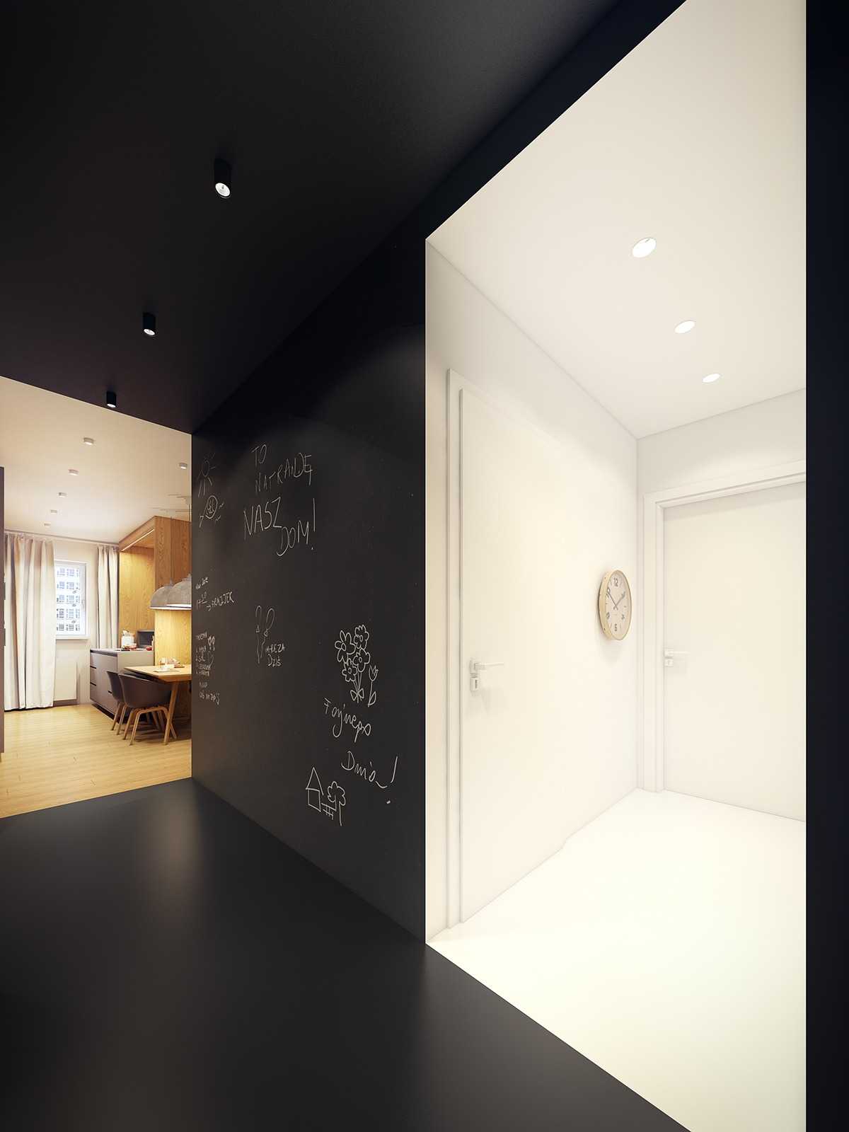 В оригинальном дизайне проекта от польской студии Plasterlino» чёрный цвет в прихожей необходим для того, чтобы обеспечить цветовое зонирование. Входная зона полностью выкрашена в чёрный (часть стен покрыта грифельной краской и на них можно писать мелом), благодаря чему удалось чётко и однозначно подчеркнуть её границы. Там, где заканчивается чёрный начинается жилое пространство.