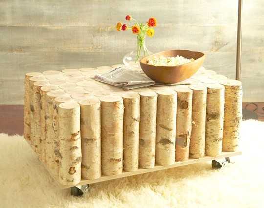 Неплохим вариантом будет сделать журнальный столик своими руками. За его основу подойдут обычные паленья. Результат можно увидеть на фото ниже