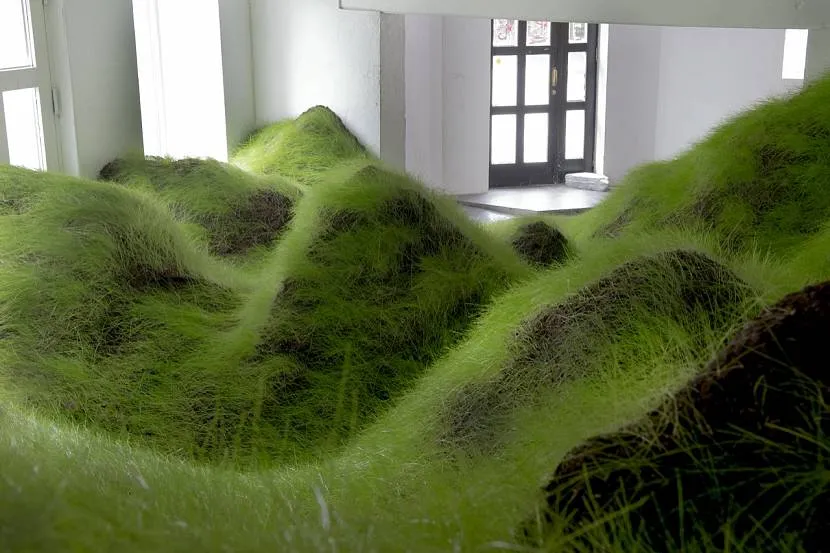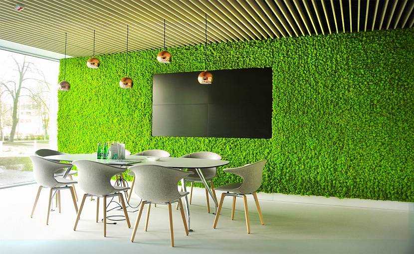 Газон – отличный фон для картин. Им при желании можно закрыть целую стену, и тогда в комнате появится яркий сочный акцент. Если нет желания так много использовать зелёного цвета, при помощи него несложно формировать небольшие вкрапления в виде панно, в виде вставок-покрывал на подоконник, в виде декора крупных аксессуаров (ваз, светильников, мягких подушек).