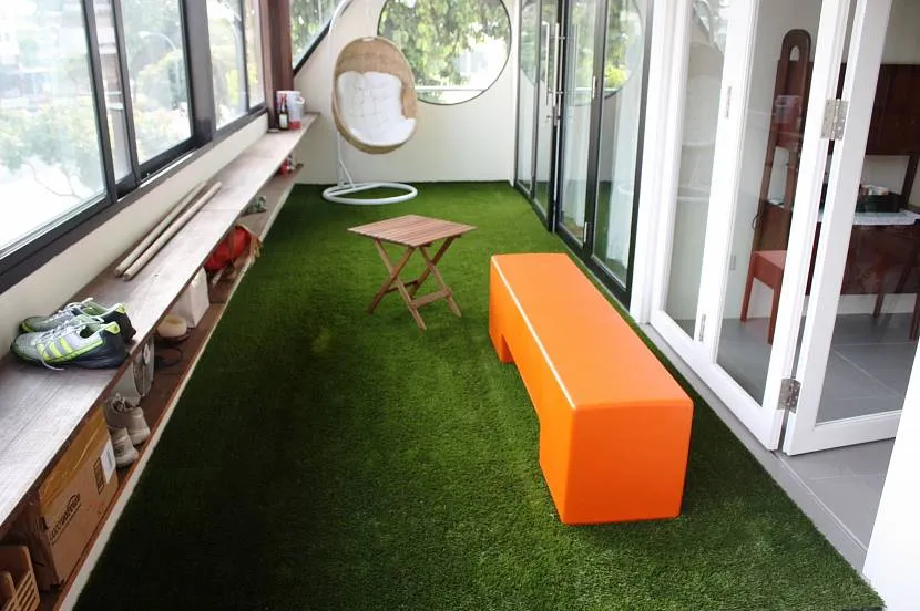 Найти применение материалу при украшении интерьера несложно. Для этого нужно лишь включить фантазию и подумать, что можно из него сделать. Искусственная трава хорошо подходит для отделки балконов. Ею можно полностью закрыть пол и скрыть неприглядные его места. Иногда полотна помогают отказываться от дорогостоящего ремонта.
