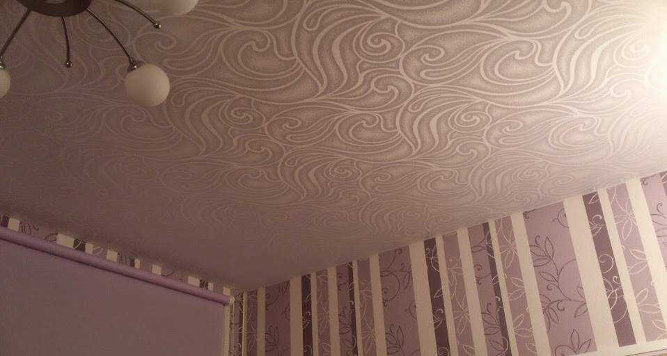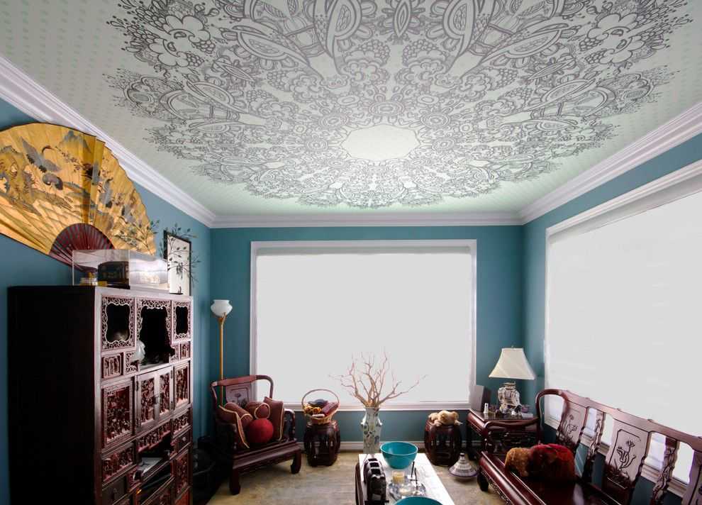 Если орнамент покрывает потолок по всей площади, лучше использовать этот вариант в небольшом помещении, чтобы дизайн не выглядел однообразно