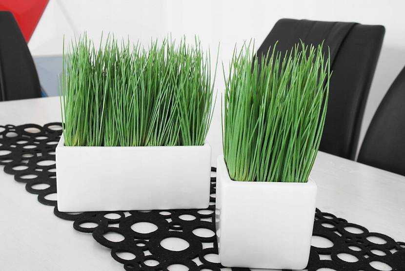 Многие отказываются от такой красоты только потому, что совсем нет времени ухаживать за ней. Искусственная трава позволила исправить ситуацию. Теперь можно любую тару заполнить сыпучим наполнителем, поверх него уложить фрагмент полотна, вырезанный точно под диаметр ёмкости. Издалека отличить искусственный аналог от естественного невозможно. Поэтому искусственная трава в горшке для декора интерьера стала использоваться достаточно широко. С помощью такого трюка полностью стирается грань между живой природой и жилым пространством.