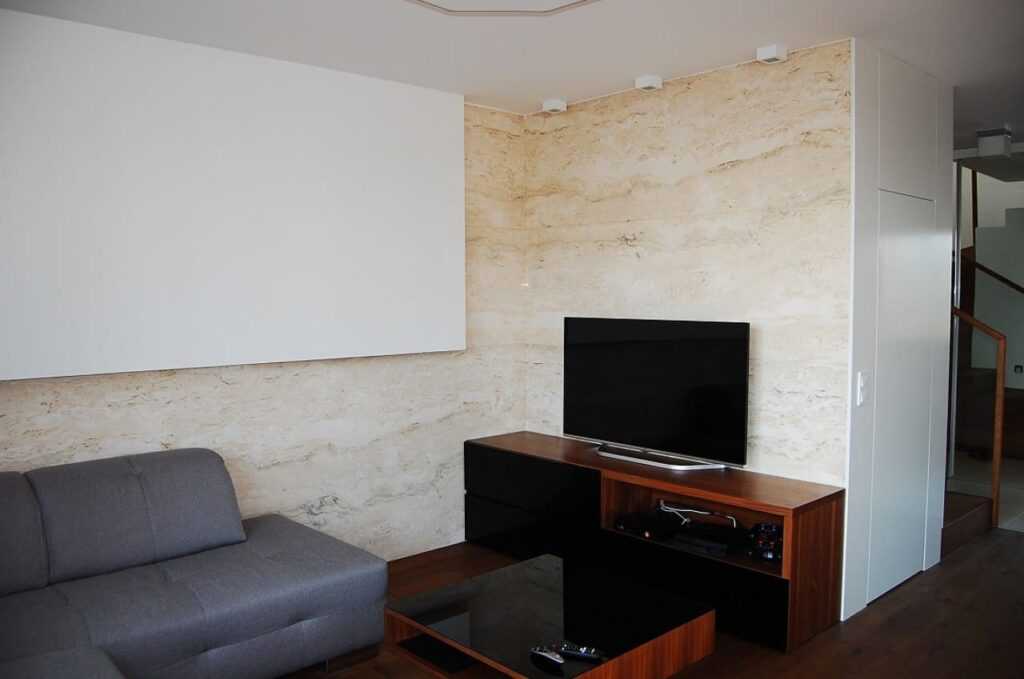 Травертин, имитация гипса — это минеральная мелкозернистая штукатурка, изготовленная на основе известкового связующего. Устойчив к истиранию, контакту с влагой и грибками. Он доступен в форме порошка, который должен быть смешан в соответствующих пропорциях в воде, и затем немедленно применен к стене или потолку. Хотя эффект только близок к внешнему виду натурального камня, он может быть успешно использован для низкобюджетных дизайнов интерьера. Чаще всего травертиновую штукатурку используют для украшения корпуса камина или стены в гостиной, но вы также можете успешно использовать ее в ванной или на кухне.