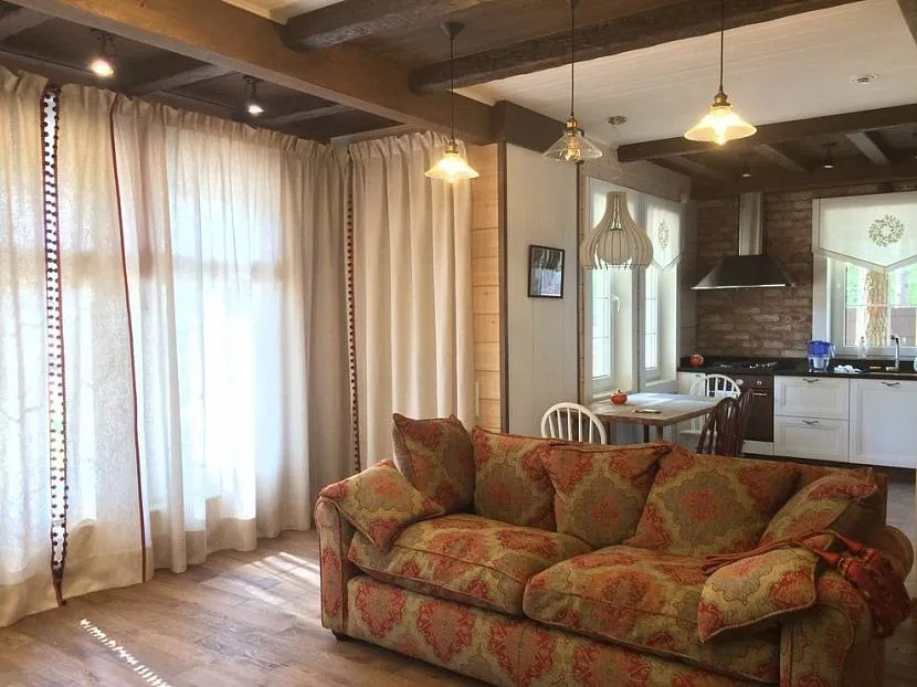 Подходящими для кухни могут быть льняные занавески в горошек или клетку длиной до половины окна, декорированные кружевом, объёмными рюшами, ручным вязанием, оригинальными подхватами. Такие шторы надеваются непосредственно на карниз или прикрепляются к нему на петли из той же ткани.