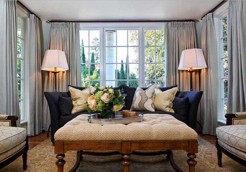 На фото классический интерьер, где шторы прикреплены к закрытому багету. Крепление на тесьму обеспечивает частую драпировку ткани.