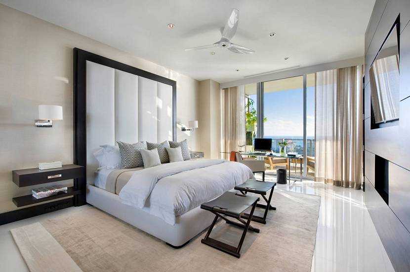 На фото спальня в современном стиле, где цветочный рисунок является объектом привлечения внимания. Вышивка бежевыми нитями по светлой органзе смотрится скромно и в то же время роскошно.