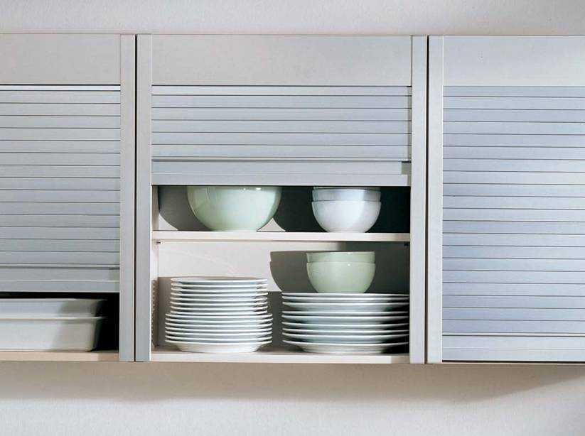 - рулонные — это простая конструкция, которую можно легко снять и поставить на прежнее место. Рулонные жалюзийные дверцы все чаще пользуются спросом. Они вращаются благодаря цепочному механизму, который приподнимает и опускает ткань. Рулонные шторки используют в шкафчиках разных размеров.
