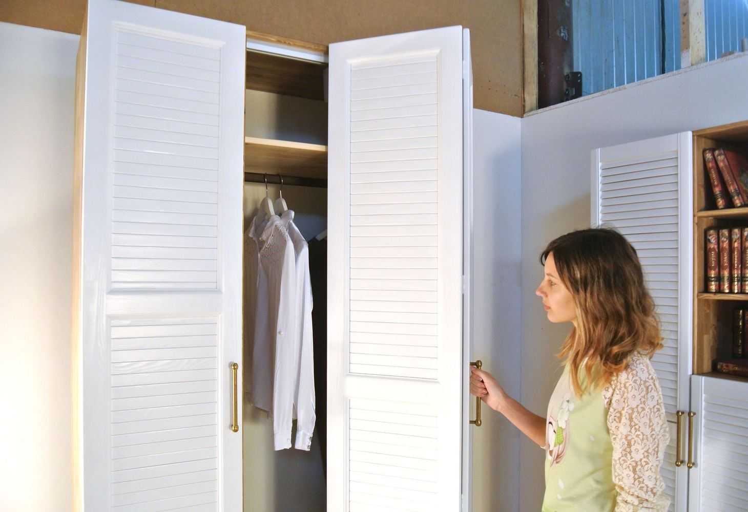 Конструкция типа «гармошка» – наилучший вариант в помещении с ограниченным пространством и невозможностью использовать распашные дверцы. Прекрасное решение для гардероба в прихожей или бельевого шкафа в узкой комнате.