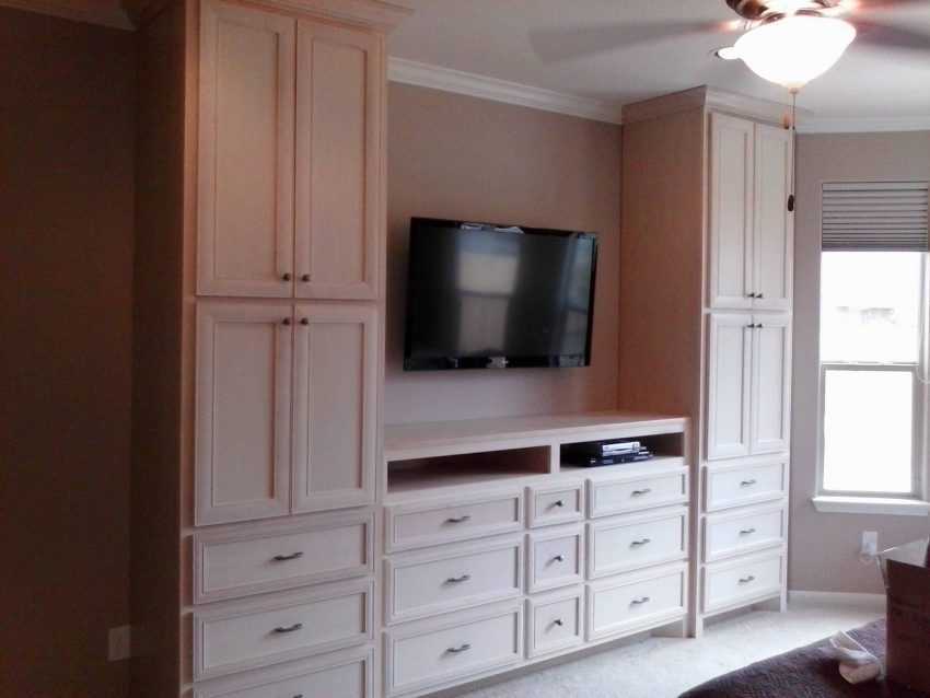 Вариантов очень много (и шкафы-купе, и мини-стенки), достаточно продумать свои потребности и создать свой собственный стильный и уютный интерьер с телевизором.