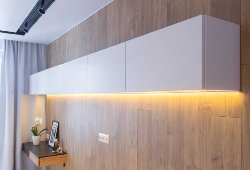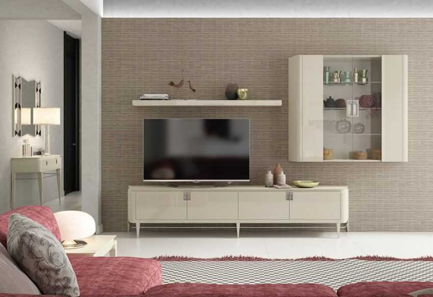 Под телевизором, висящим на стене, может стоять тумба или туалетный столик. Если же экран висит высоко, под ним можно расположить целый комод. Согласитесь, это не очень практично — отводить часть стены только под ТВ-панель.
