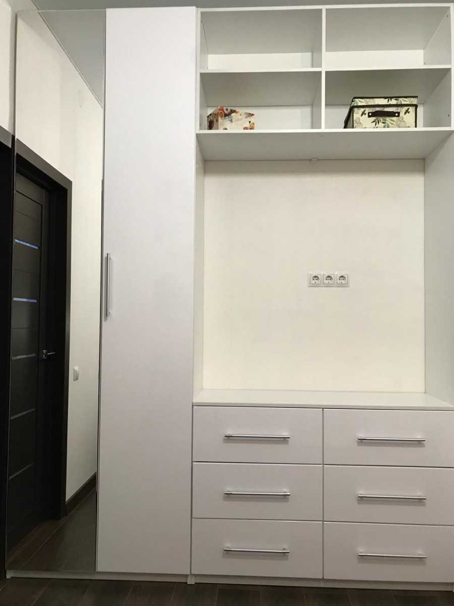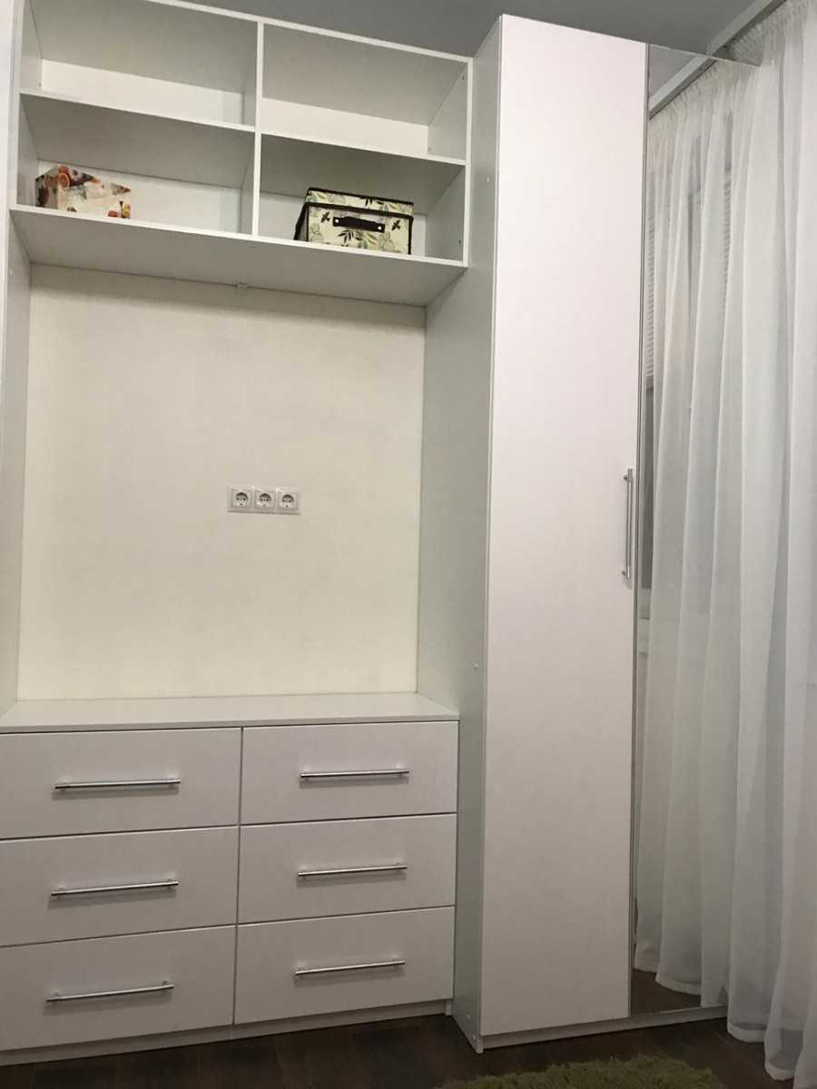 Можно встроить телевизор в дверцу шкафа купе или повесить прямо на нее. Это решение для практичного и экономичного расположения элементов в небольшом помещении.