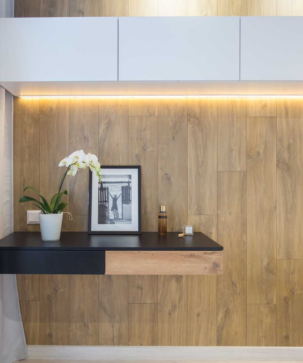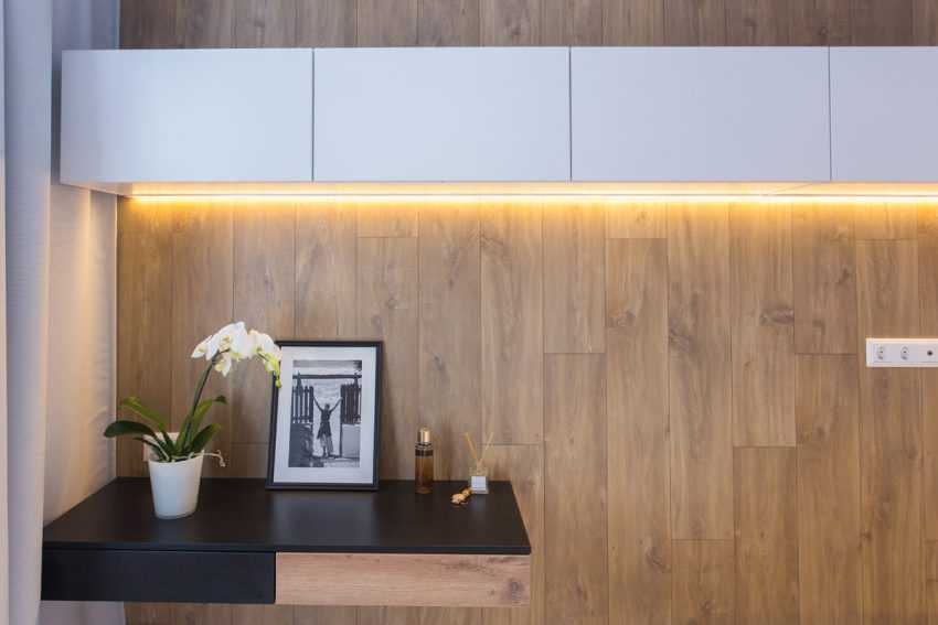 - Если стена будет активной с подсветкой, красивым панно или другим декором на всю стену, то полка внизу будет смотреться неуместно.