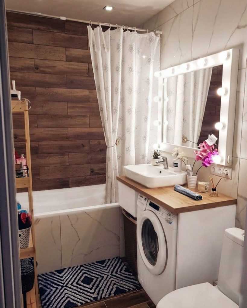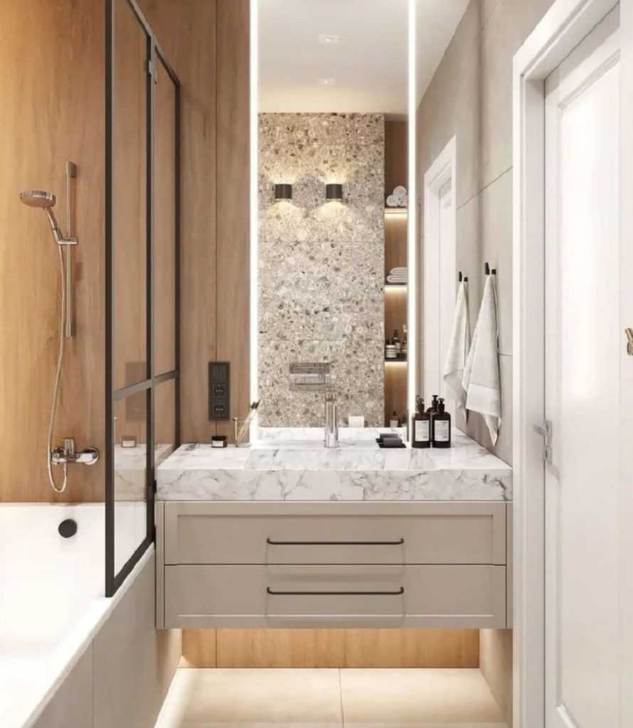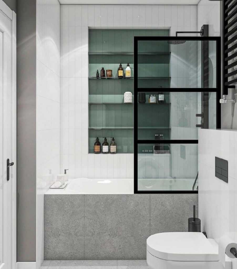 Если есть возможность – сделайте в стене нишу и поместите туда стиральную машину, оборудование по нагреванию воды или просто установите полки для косметических средств.