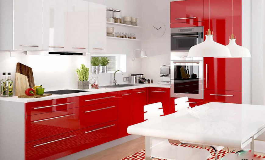 Чтобы сделать оформление кухонного пространства максимально ярким, можно остановиться на красных цветах интерьера. В такой палитре лучше выбрать теплые тона с желтым или коричневым отливом, либо холодные — с синими и фиолетовыми акцентами. Грубая ошибка — использовать чистый красный, т.к. он быстро надоест и будет выглядеть раздражающе.