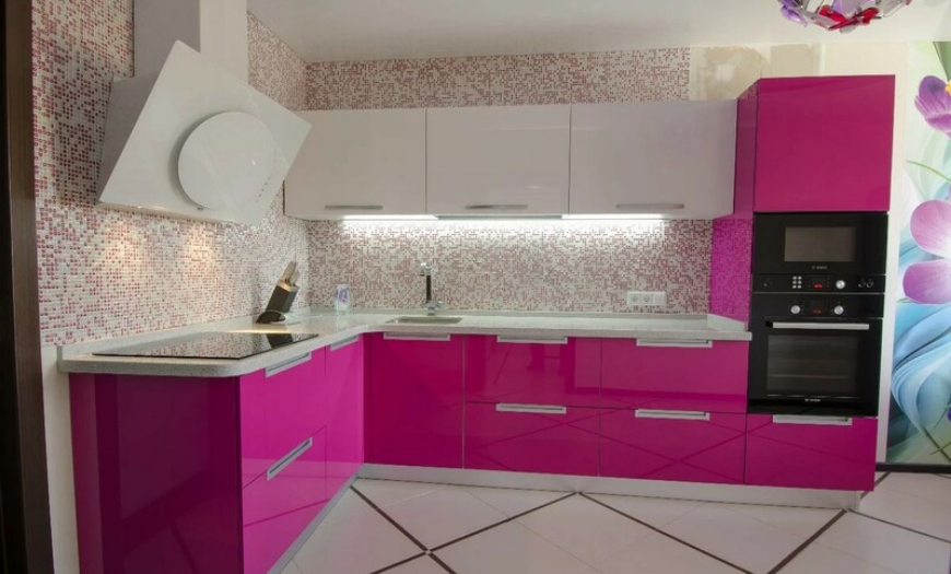 Такая палитра встречается на кухне редко, т.к. считается детской и неподходящей для этой части дома. Однако правильно оформленный дизайн в розовых оттенках выглядит гармонично и элегантно. Главное — правильно совместить его с другими тонами.