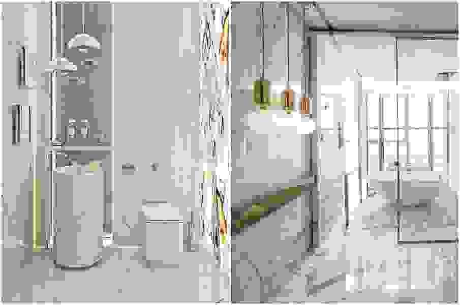 Светлая ванная комната с акцентной мраморной отделкой