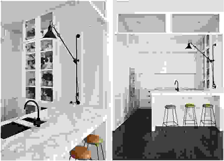 Мраморная столешница прекрасно дополняет аскетичный интерьер кухни