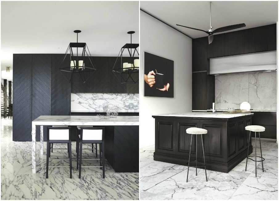 Контрастное сочетание чёрного кухонного гарнитура и светлых мраморных полов