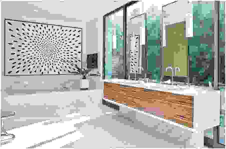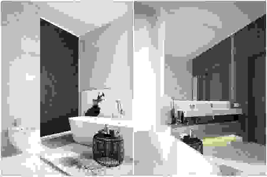 В такой ванной комнате преобладает прозрачное, чистое стекло и холодный металл (хром, алюминий), а в цветовой гамме доминируют белый и серый цвета. Хорошее решение на стенах и полу – плитка под серый, бежевый или белый мрамор. Появляющиеся акценты из светлого дерева согревают интерьер. Освещение также играет важную роль. Чаще всего это система точечных светильников, например, галогенных, размещенных в подвесном потолке. В этом стиле ненужные украшения сведены к минимуму.