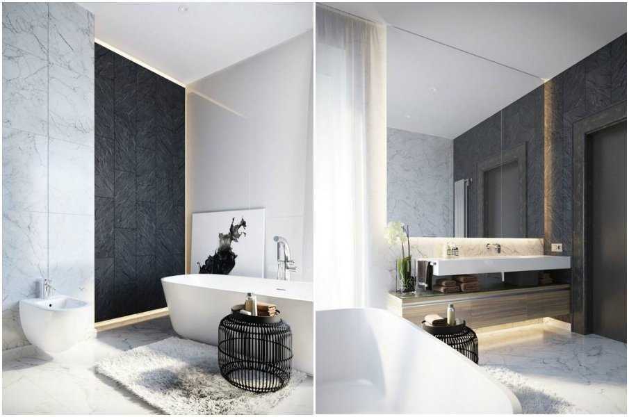 Комбинация светлого и тёмного мрамора в интерьере ванной комнаты