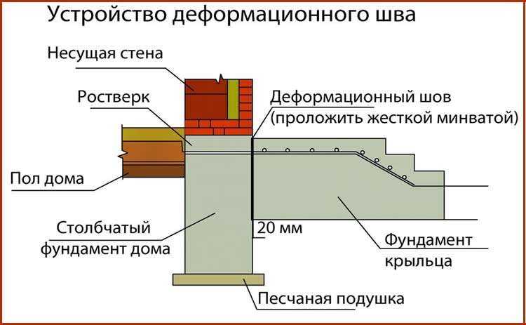 В оптимальном случае фундамент для веранды должен быть таким же по типу и глубине, как и основание частного дома. Если это невозможно, то придется создать деформационный шов, исключив возможность проседания почвы.