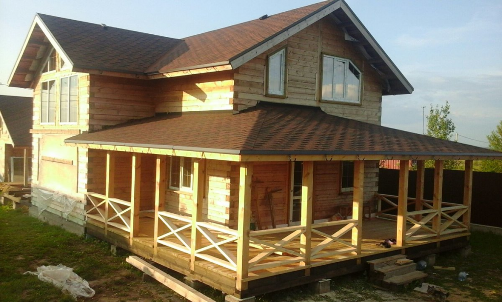 Каркас возводиться из досок и бруса. При постройке необходимо создать уклон во избежание скопления лишних осадков. Материал для кровли может быть любой от рубероида до черепицы, все зависит от проекта веранды.