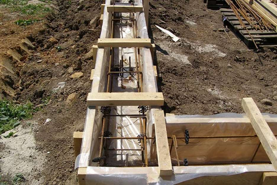 Траншею необходимо выкопать шириной примерно в 30 см и глубиной от 80 см. Внутри участка засыпается песок. Внутрь траншеи ставится опалубка, проводится армирование фундамента при помощи арматуры и алюминиевой проволоки.
