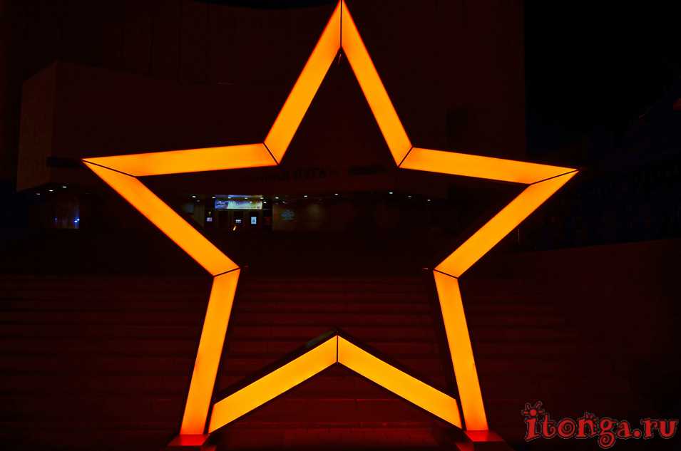 Ночью он предстает в обрамлении ярко-красных звезд.