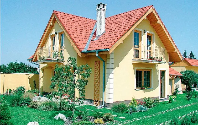 Четырехскатная вальмовая крыша оригинально выглядит, защищает фасад от осадков и не боится сильного ветра. Под ней можно обустроить мансарду или чердак, но их площадь будет меньше, чем в двускатном варианте. Минус конструкции – сложность и трудоемкость возведения.