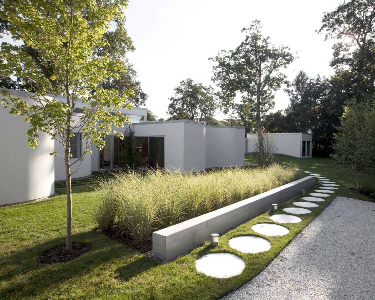 Роль декоративных элементов в минималистическом саду отводится отсыпке, бордюрам и дорожкам