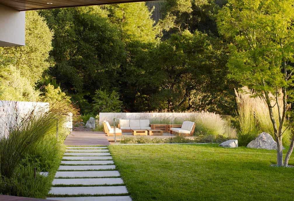 - Сквозное зонирование. В отличие от других стилевых направлений, участок делится на зоны условно и напоминает квартиру-студию. Для зонирования используются простые средства, не разделяющие визуально территорию — габионы, контейнеры с цветами или дорожки. Хороший способ — разделение с использованием перепадов высот, для чего идеально подходят настилы.
