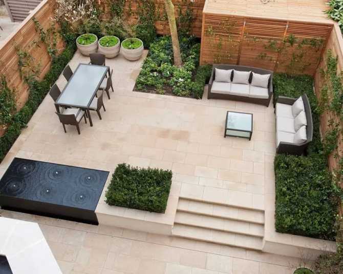 - Патио и подиумы. Площадки и настилы разного уровня — главный акцент данного стиля. Они соединяются между собой дорожками, ступеньками или лестницей в зависимости от того, где их располагают. В форме прослеживаются геометрические фигуры: квадраты, ромбы, треугольники. Ступени устанавливают в классическом стиле, вееро- или винтообразно. Главные нюансы заключаются в форме и размере, цвет и материал отходят на задний план, хотя все элементы выполняются из одного сырья.