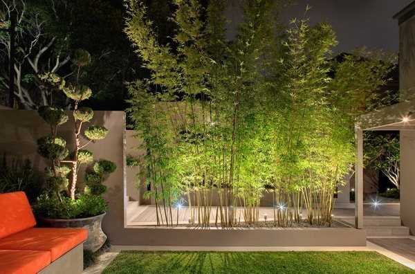 Экостиль общего оформления ландшафта поддерживает ограждение из бамбука.
