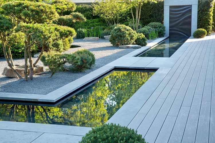 - Водоем. Никаких замысловатых и вычурных фонтанов или водопадов сооружать не нужно, стилю подходит приподнятый декоративный прудик или небольшой бассейн, все зависит от размера вашего участка. Форма водоема может быть только геометрической с четкими овальными, прямоугольными или круглыми контурами.