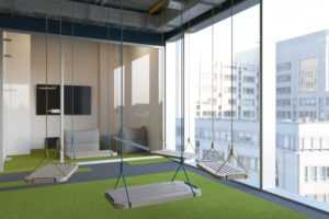 Разрабатывая проект офиса IT-компании Fortis Online, мы разместили в зоне отдыха мягкие диванчики и качели.
