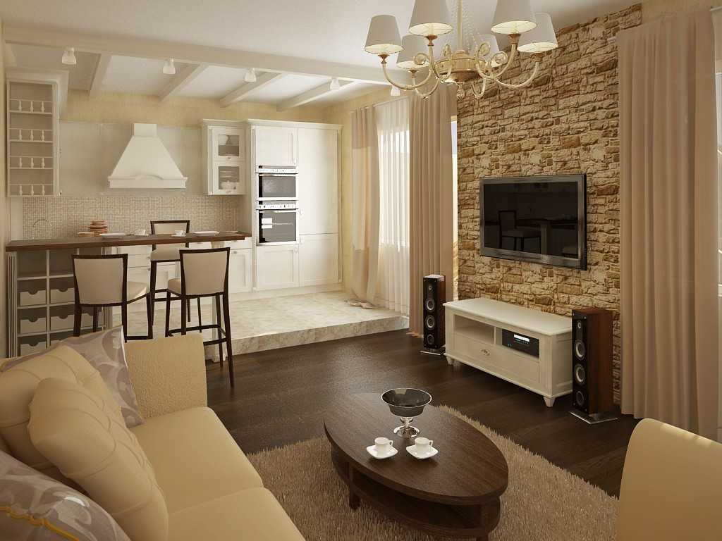 Зал-кухня в теплых, мягких цветах
